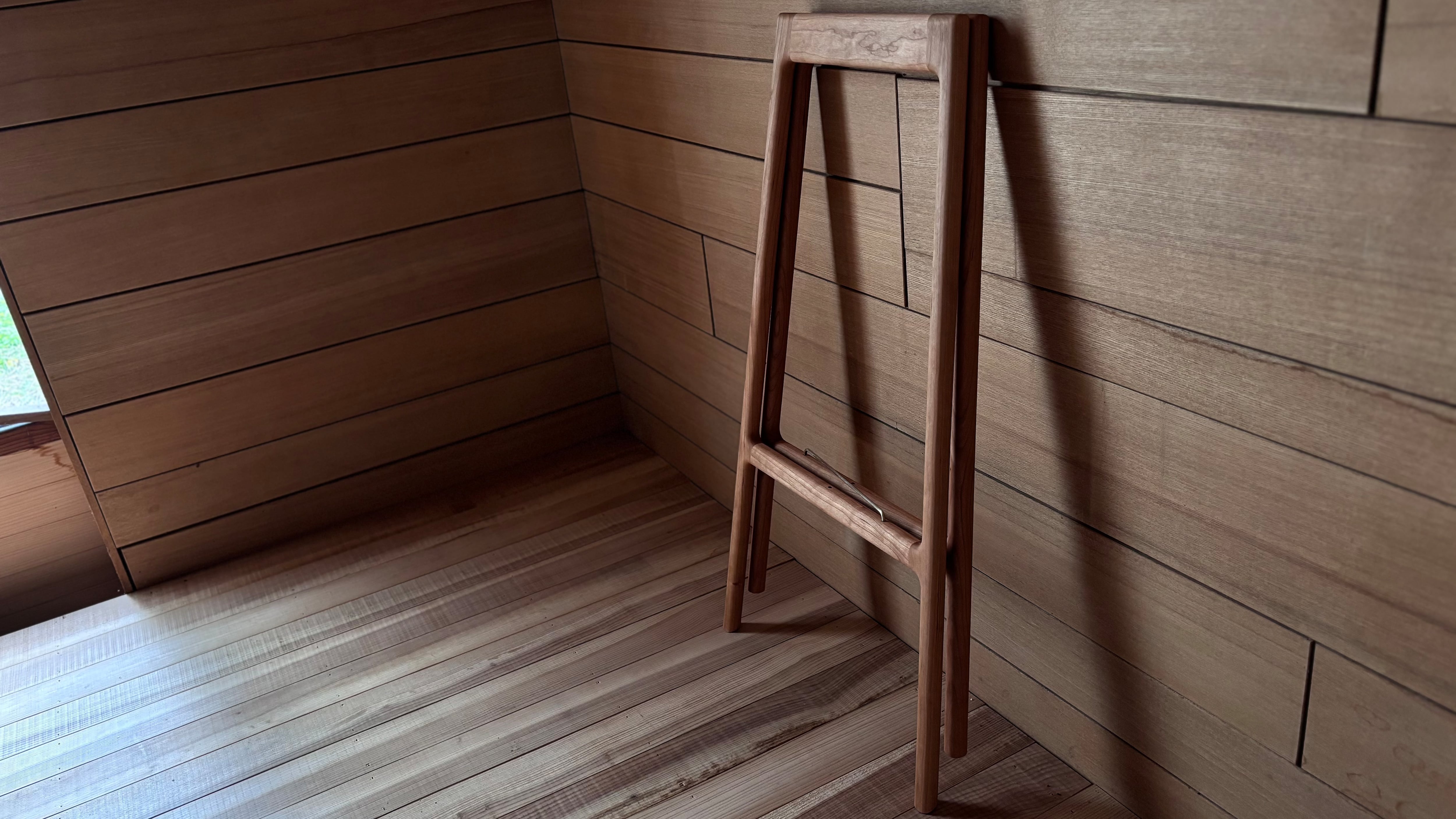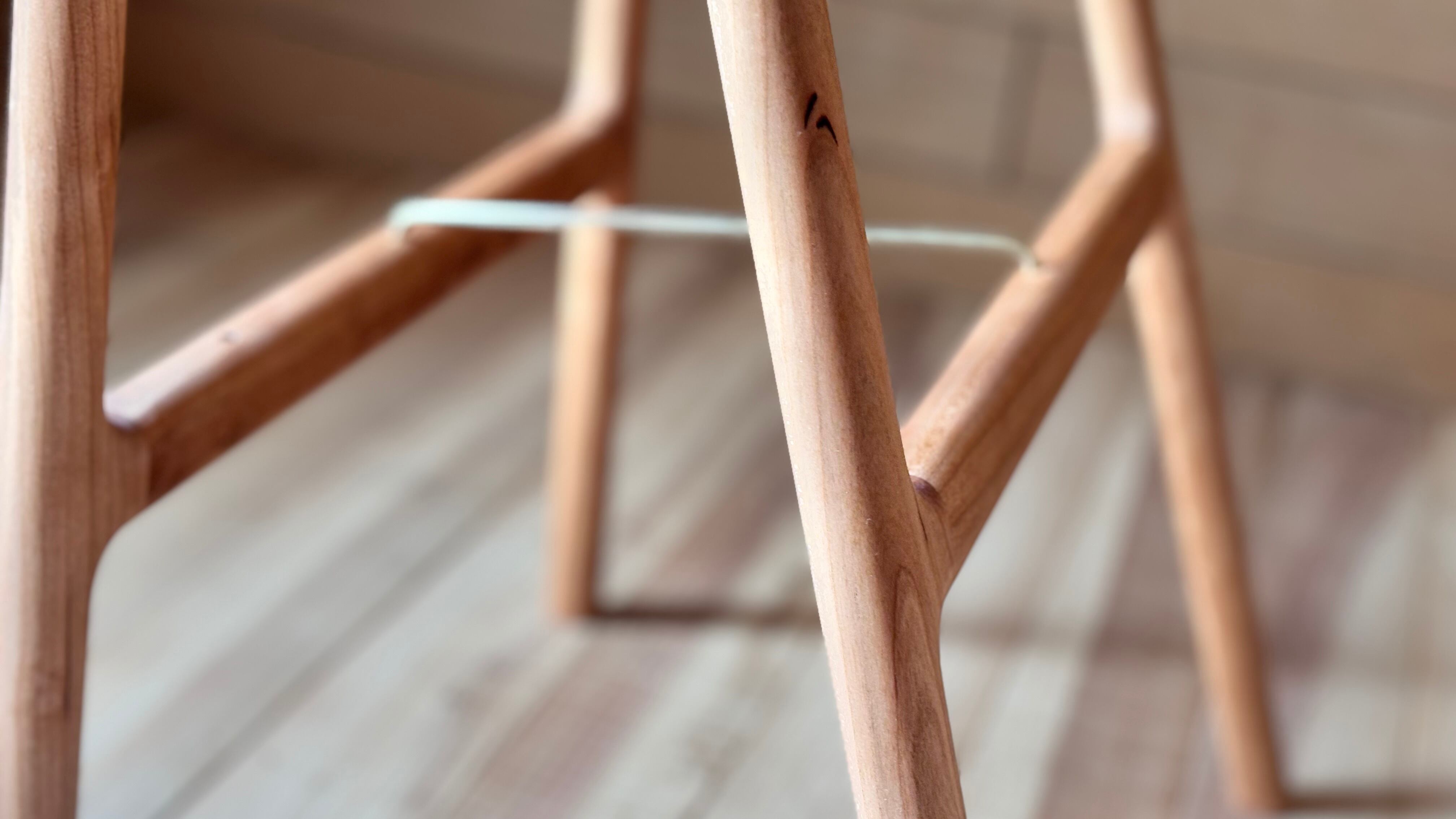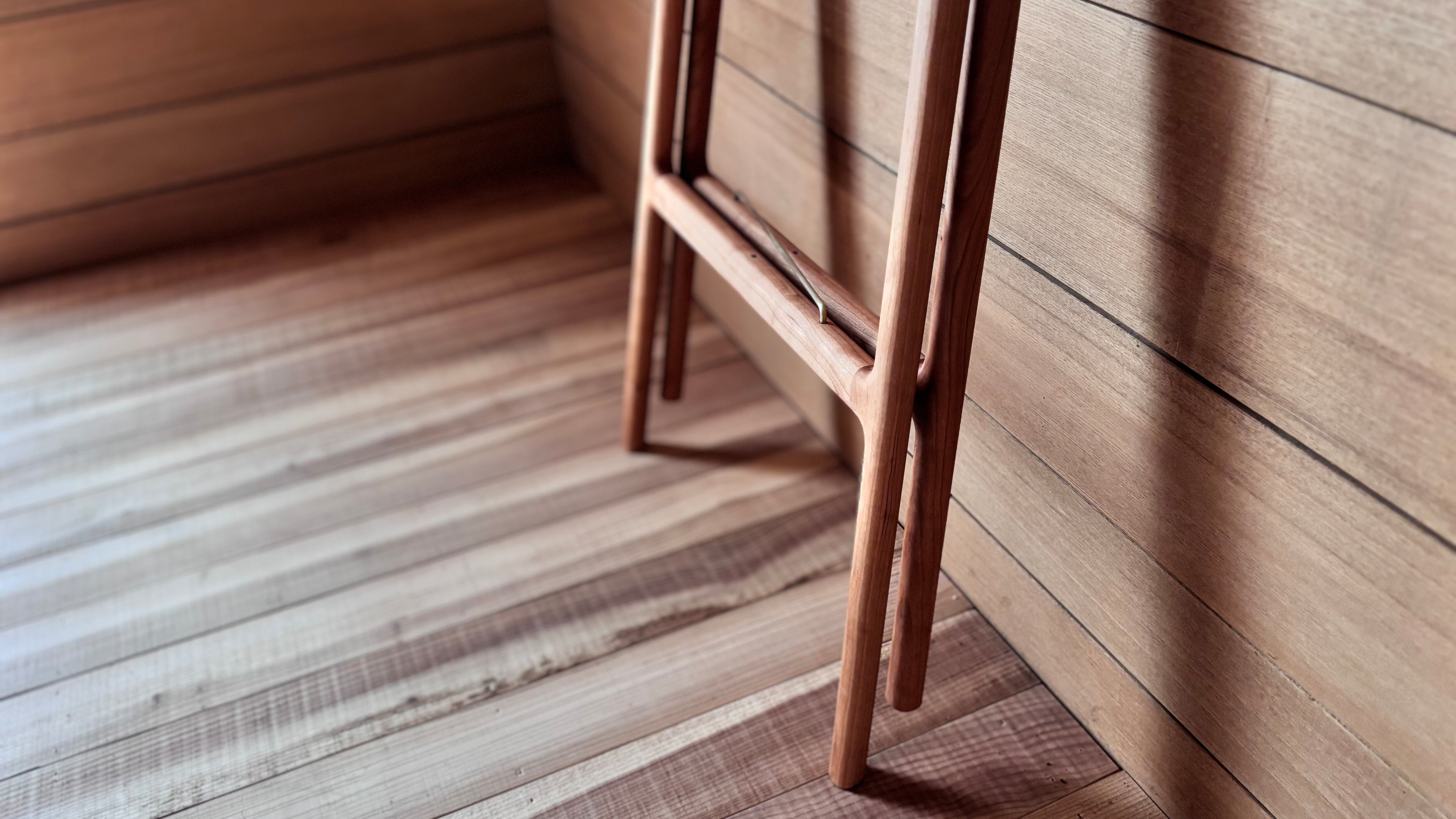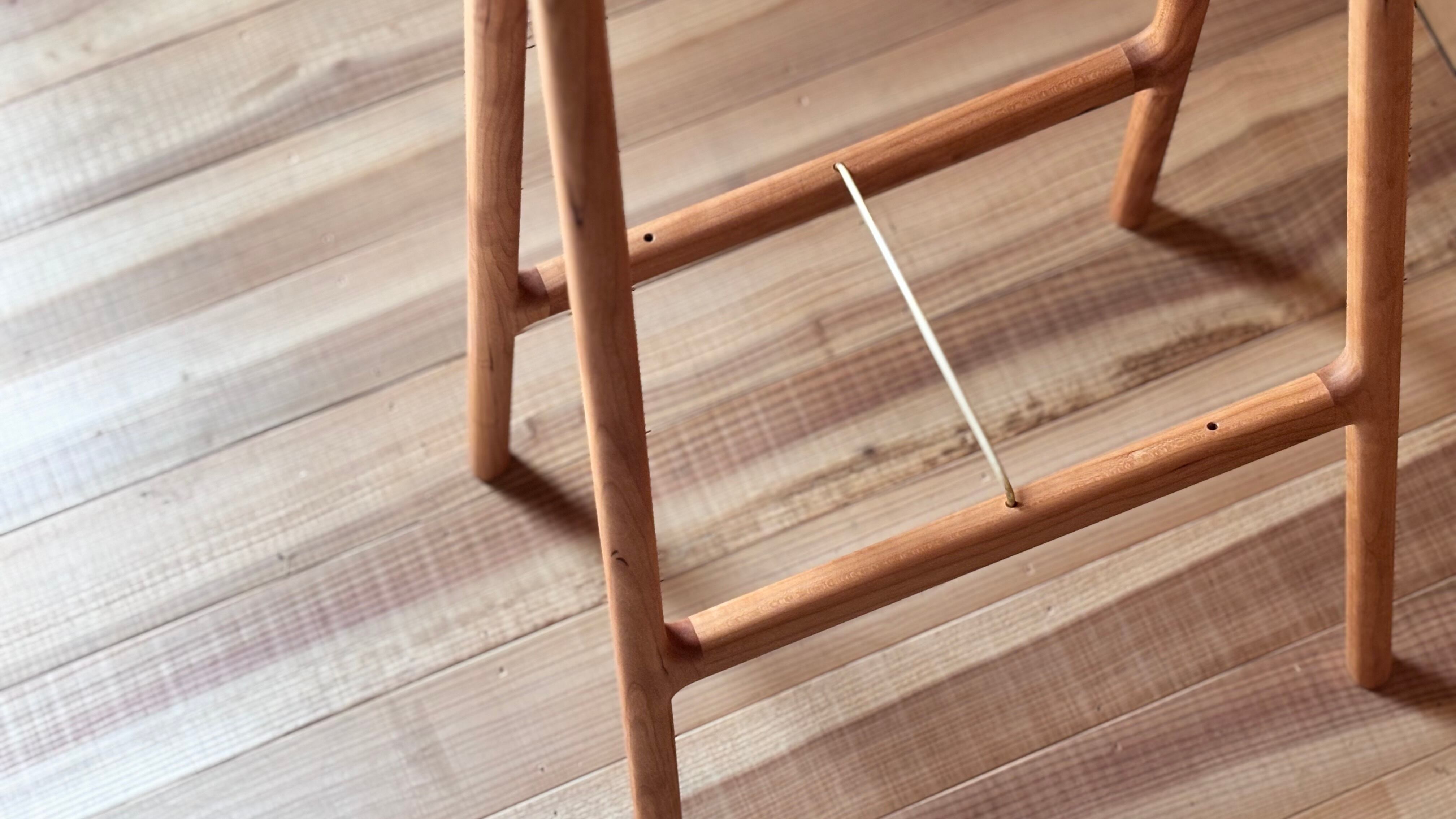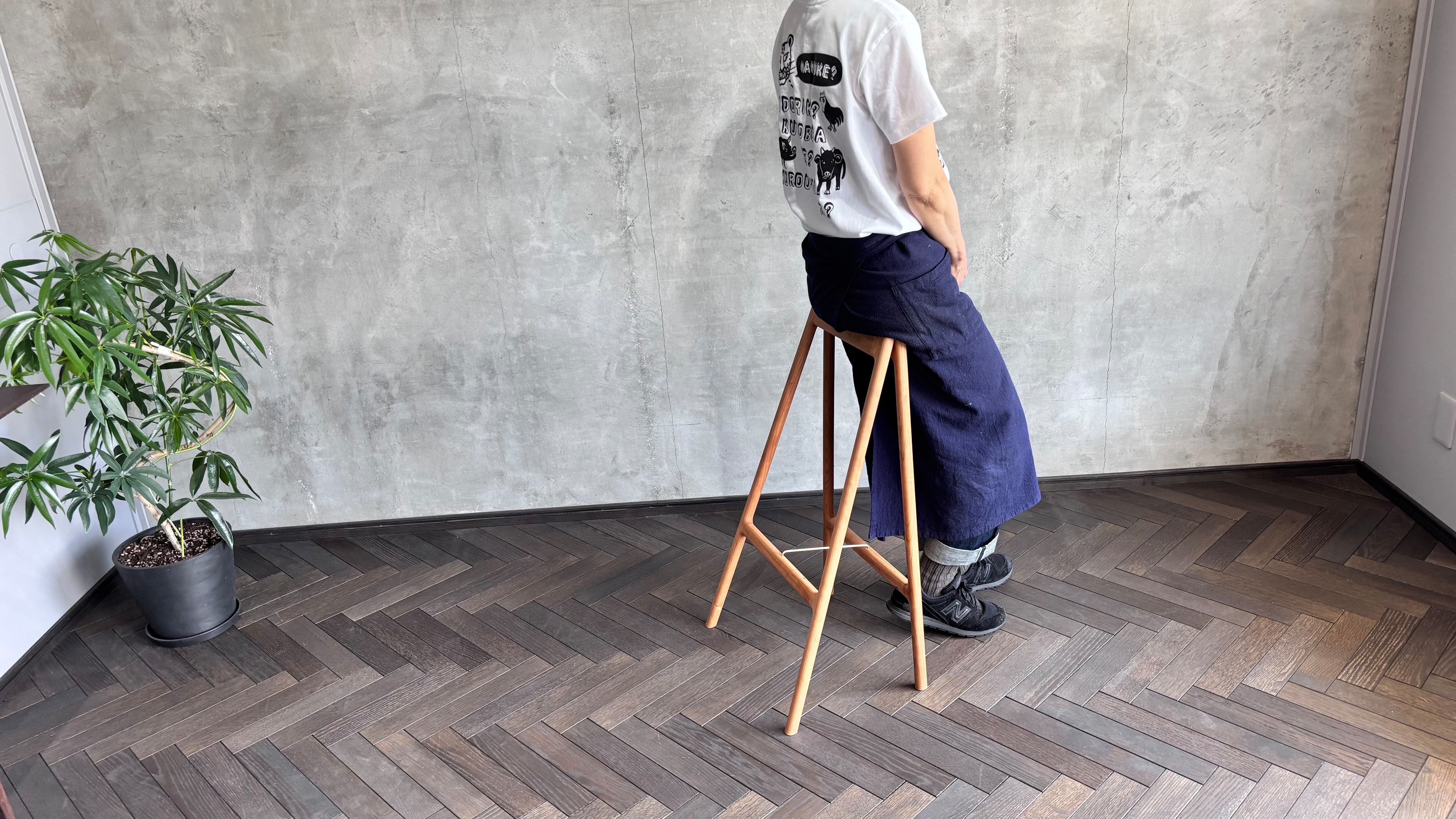 立った状態から少しだけ膝を曲げ、お尻をちょこっと乗せる。「支える力」と「作業性」のバランスを考えるとお尻から3cm低い座面に身体を預ける、サイズオーダーという答えとなりました。
