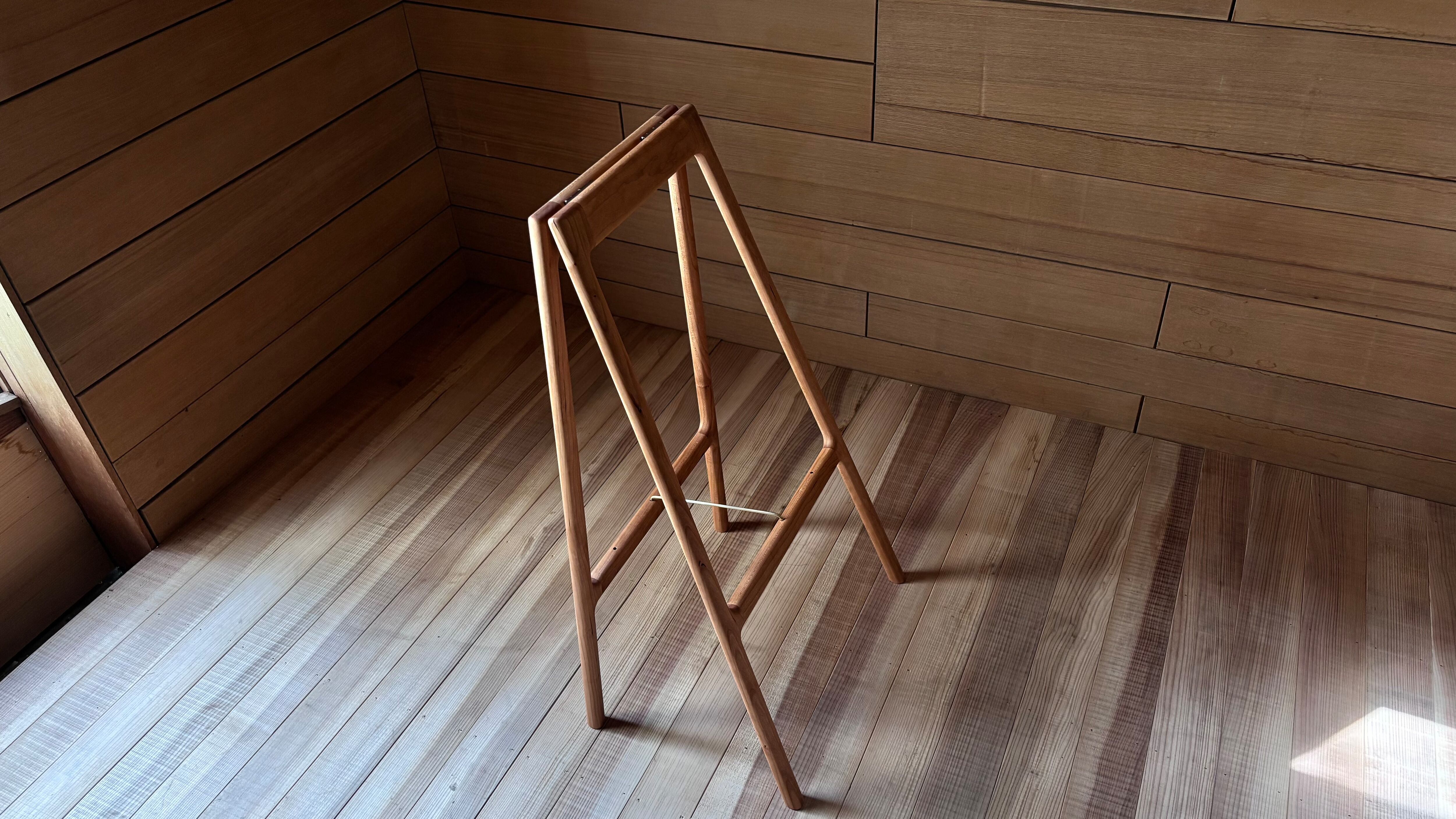 使用頻度を考え、使用しない時は折り畳めるようにし、使用時にアクセントにもなる真鍮棒は、収納時には固定用の金具となります。